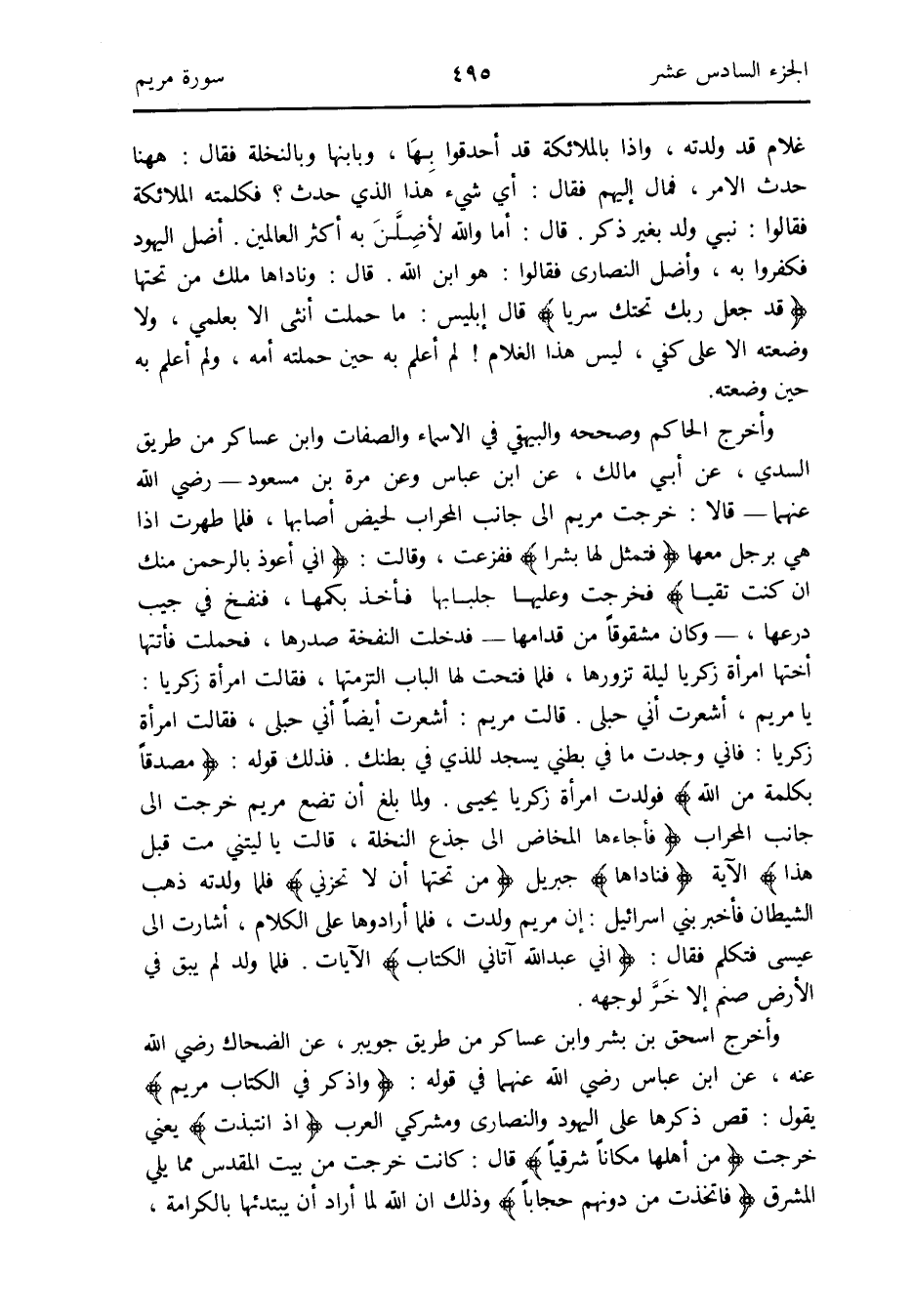 وَأخرج الْحَاكِم وَصَححهُ وَالْبَيْهَقِيّ فِي الْأَسْمَاء وَالصِّفَات وَابْن عَسَاكِر من طَرِيق السّديّ عَن أبي مَالك عَن ابْن عَبَّاس وَعَن مرّة بن مَسْعُود - رَضِي الله عَنْهُمَا - قَالَا: خرجت مَرْيَم إِلَى جَانب الْمِحْرَاب لحيض أَصَابَهَا فَلَمَّا طهرت إِذْ هِيَ بِرَجُل مَعهَا {فتمثل لَهَا بشرا} فَفَزِعت وَقَالَ: {إِنِّي أعوذ بالرحمن مِنْك إِن كنت تقياً} فَخرجت وَعَلَيْهَا جلبابها فَأخذ بكمها فَنفخ فِي جيب درعها - وَكَانَ مشقوقاً من قدامها - فَدخلت النفخة صدرها فَحملت فأتتها أُخْتهَا امْرَأَة لَيْلَة تزورها فَلَمَّا فتحت لَهَا الْبَاب التزمتها فَقَالَت امْرَأَة زَكَرِيَّا: يَا مَرْيَم أشعرت أَنِّي حُبْلَى