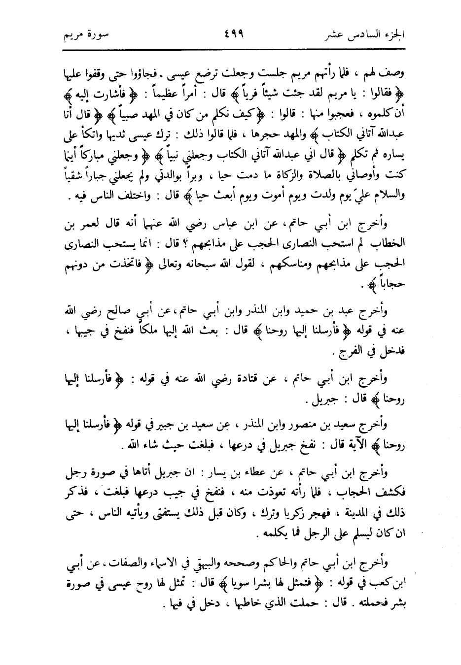 وَأخرج سعيد بن مَنْصُور وَابْن الْمُنْذر عَن سعيد بن جُبَير فِي قَوْله: {فَأَرْسَلنَا إِلَيْهَا رُوحنَا} الْآيَة قَالَ: نفخ جِبْرِيل فِي درعها فبلغت حَيْثُ شَاءَ الله