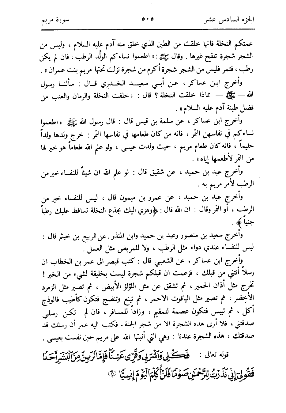 وَأخرج ابْن عَسَاكِر عَن الشّعبِيّ قَالَ: كتب قَيْصر إِلَى عمر بن الْخطاب أَن رسلًا أَتَتْنِي من قبلك فَزَعَمت أَن قبلكُمْ شَجَرَة لَيست بخليقة لشَيْء من الْخَيْر تخرج مثل أَذَان الْحمير ثمَّ تشقق عَن مثل اللُّؤْلُؤ الْأَبْيَض ثمَّ تصير مثل الزمرد الْأَخْضَر ثمَّ تصير مثل الْيَاقُوت الْأَحْمَر ثمَّ تينع وتنضج فَتكون كأطيب فالوذج أكل ثمَّ تيبس فَتكون عصمَة للمقيم وَزَادا للْمُسَافِر فَإِن لم تكن رُسُلِي صدقتني فَلَا أرى هَذِه الشَّجَرَة إِلَّا من شجر الْجنَّة فَكتب إِلَيْهِ عمر أَن رسلك قد صدقتك هَذِه الشَّجَرَة عندنَا: وَهِي الَّتِي أنبتها الله على مَرْيَم حِين نفست بِعِيسَى