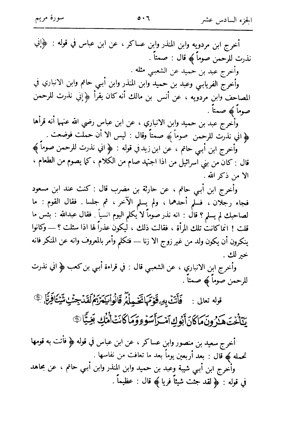 أخرج ابْن مرْدَوَيْه وَابْن الْمُنْذر وَابْن عَسَاكِر عَن ابْن عَبَّاس فِي قَوْله: {إِنِّي نذرت للرحمن صوما} قَالَ: صمتا