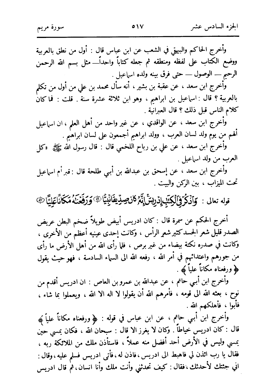 وَأخرج ابْن أبي حَاتِم عَن ابْن عَبَّاس فِي قَوْله: {وَرَفَعْنَاهُ مَكَانا عليا} قَالَ: كَانَ إِدْرِيس خياطاً