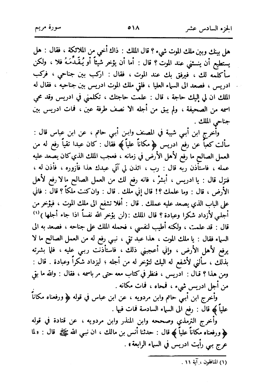 وَأخرج ابْن أبي شيبَة فِي المُصَنّف وَابْن أبي حَاتِم عَن ابْن عَبَّاس قَالَ: سَأَلت كَعْبًا عَن رفع إِدْرِيس {مَكَانا عليا} فَقَالَ: كَانَ عبدا تقياً رفع لَهُ من الْعَمَل الصَّالح مَا رفع لأهل الأَرْض فِي زَمَانه فَعجب الْملك الَّذِي كَانَ يصعد عَلَيْهِ عمله فَاسْتَأْذن ربه قَالَ: رب ائْذَنْ لي آتِي عَبدك هَذَا فأزوره فَأذن لَهُ فَنزل قَالَ: يَا إِدْرِيس أبشرْ فَإِنَّهُ رفع لَك من الْعَمَل الصَّالح مَا لَا رفع لأهل الأَرْض قَالَ: وَمَا علمك قَالَ إِنِّي ملك