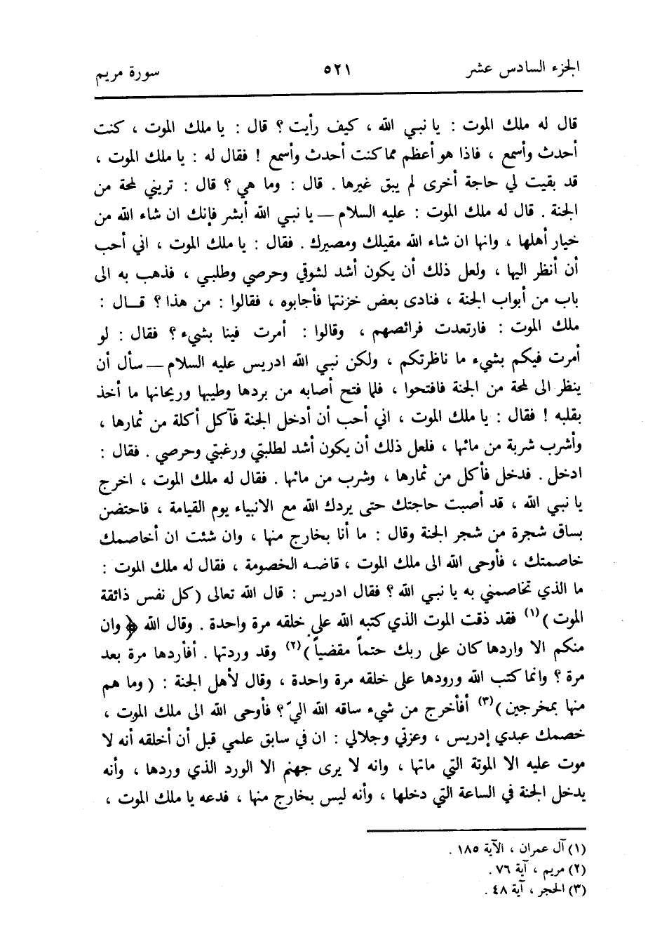 فَقَالَ لَهُ ملك الْمَوْت: مَا الَّذِي تخاصمني بِهِ يَا نَبِي الله فَقَالَ إِدْرِيس: قَالَ الله تَعَالَى (كل نفس ذائقة الْمَوْت) (آل عمرَان الْآيَة 185) فقد ذقت الْمَوْت الَّذِي كتبه الله على خلقه مرّة وَاحِدَة