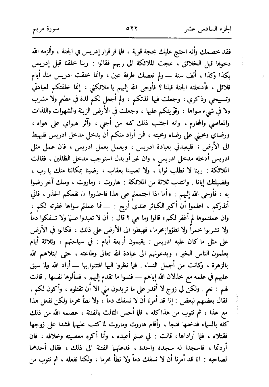 فَلَمَّا قر قَرَار إِدْرِيس فِي الْجنَّة وألزمه الله دُخُولهَا قبل الْخَلَائق عجت الْمَلَائِكَة إِلَى رَبهم فَقَالُوا: رَبنَا خلقت [خلقتنا قبل] إِدْرِيس بِكَذَا وَكَذَا ألف سنة - وَلم نعصك طرفَة عين وَإِنَّمَا خلقت إِدْرِيس مُنْذُ أَيَّام قَلَائِل فأدخلته الْجنَّة قبلنَا فَأوحى الله إِلَيْهِم: يَا ملائكتي إِنَّمَا خلقتكم لعبادتي وتسبيحي وذكري وَجعلت فِيهَا لذتكم وَلم أجعَل لكم لَذَّة فِي مطعم وَلَا مشرب وَلَا فِي شَيْء سواهَا وقوّيتكم عَلَيْهَا وَجعلت فِي الأَرْض الزِّينَة والشهوات وَاللَّذَّات والمعاصي والمحارم وَإنَّهُ اجْتنب ذَلِك كُله من أَجلي وآثر هواي على هَوَاهُ ورضاي ومحبتي على رِضَاهُ ومحبته فَمن أَرَادَ مِنْكُم أَن يدْخل مدْخل إِدْرِيس فليهبط إِلَى الأَرْض فليعبدني بِعبَادة إِدْرِيس وَيعْمل بِعَمَل إِدْرِيس فَإِن عمل مثل إِدْرِيس أدخلهُ مدْخل إِدْرِيس وَإِن غير أَو بدل اسْتوْجبَ مدْخل الظَّالِمين