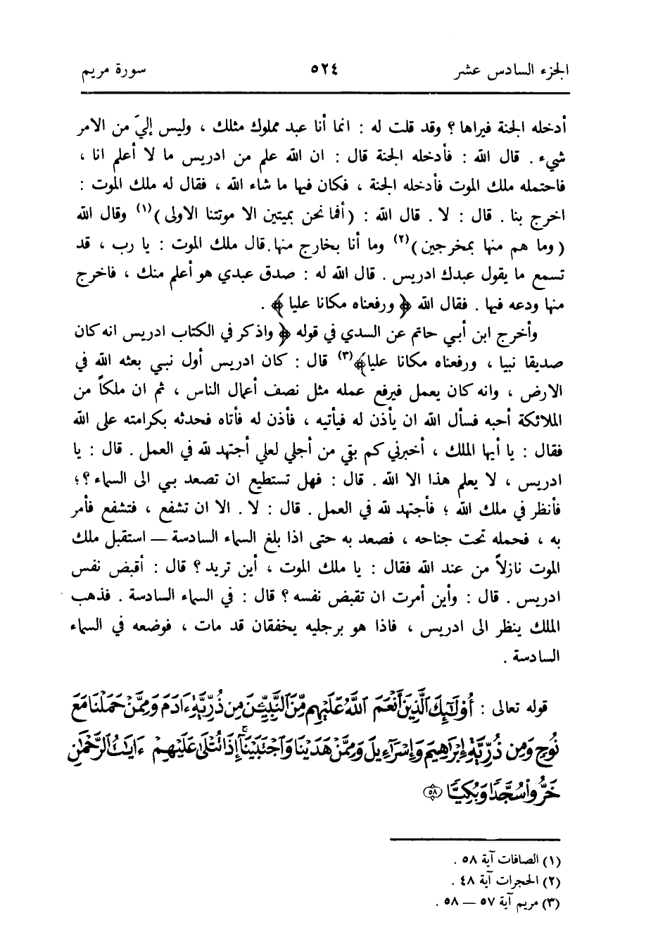 وَأخرج ابْن أبي حَاتِم عَن السّديّ فِي قَوْله: {وَاذْكُر فِي الْكتاب إِدْرِيس إِنَّه كَانَ صديقا نَبيا وَرَفَعْنَاهُ مَكَانا عليا} مَرْيَم آيَة 57 - 58 قَالَ: كَانَ إِدْرِيس أول نَبِي بَعثه الله فِي الأَرْض وَإنَّهُ كَانَ يعْمل فيرفع عمله مثل نصف أَعمال النَّاس ثمَّ إِن ملكا من الْمَلَائِكَة أحبه فَسَأَلَ الله أَن يَأْذَن لَهُ فيأتيه فَأذن لَهُ فَأَتَاهُ فَحَدَّثته بكرامته على الله فَقَالَ: يَا أَيهَا الْملك أَخْبرنِي كم بَقِي من أَجلي لعَلي أجتهد لله فِي الْعَمَل