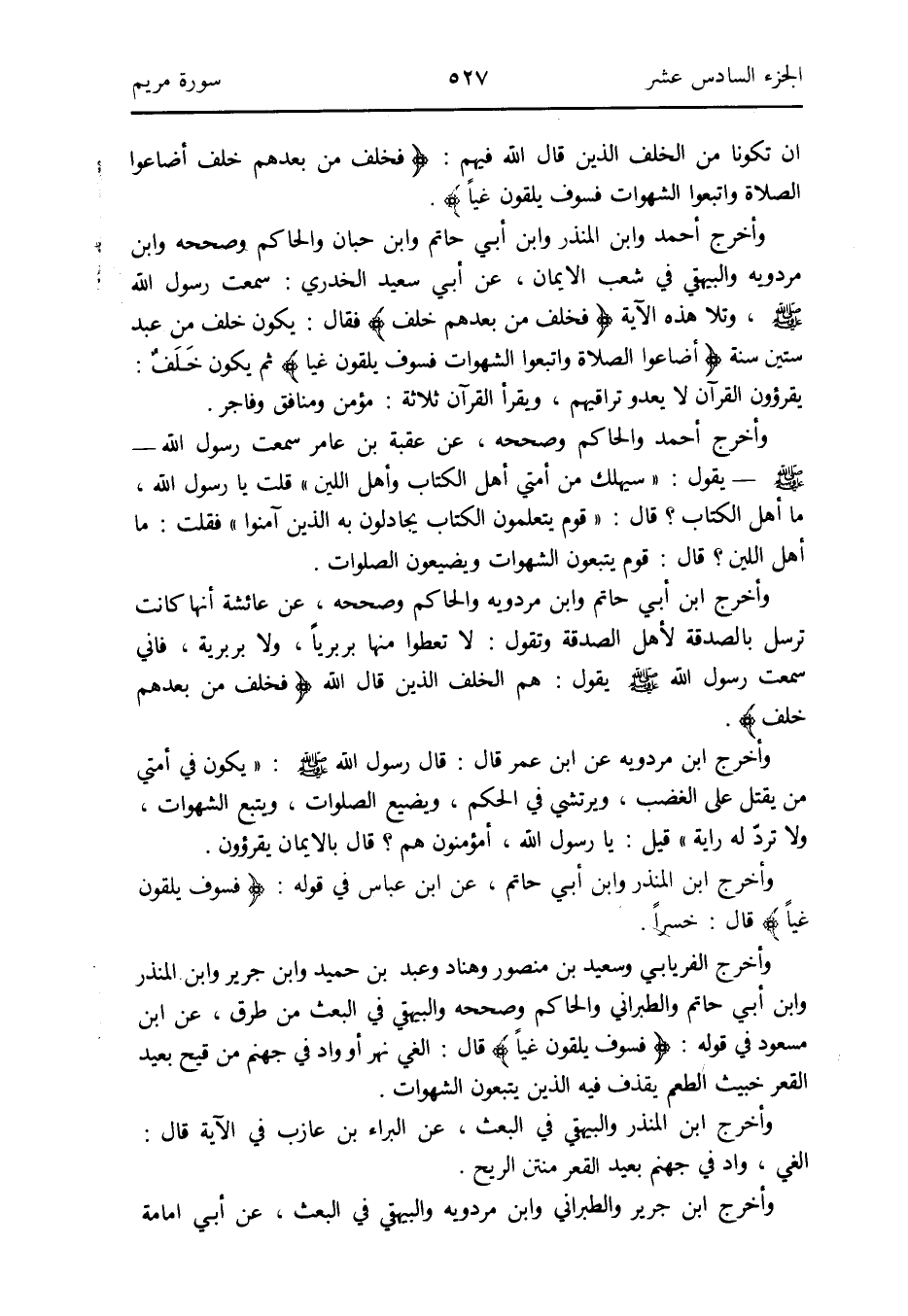 وَأخرج أَحْمد وَابْن الْمُنْذر وَابْن أبي حَاتِم وَابْن حبَان وَالْحَاكِم وَصَححهُ وَابْن مرْدَوَيْه وَالْبَيْهَقِيّ فِي شعب الإِيمان عَن أبي سعيد الْخُدْرِيّ: سَمِعت رَسُول الله صلى الله عَلَيْهِ وَسلم وتلا هَذِه الْآيَة {فخلف من بعدهمْ خلف} فَقَالَ: يكون خلف من عبد سِتِّينَ سنة {أضاعوا الصَّلَاة وَاتبعُوا الشَّهَوَات فَسَوف يلقون غيا} ثمَّ يكون خَلَفٌ: يقرؤون الْقُرْآن لَا يعدو تراقيهم وَيقْرَأ الْقُرْآن ثَلَاثَة: مُؤمن ومنافق وَفَاجِر