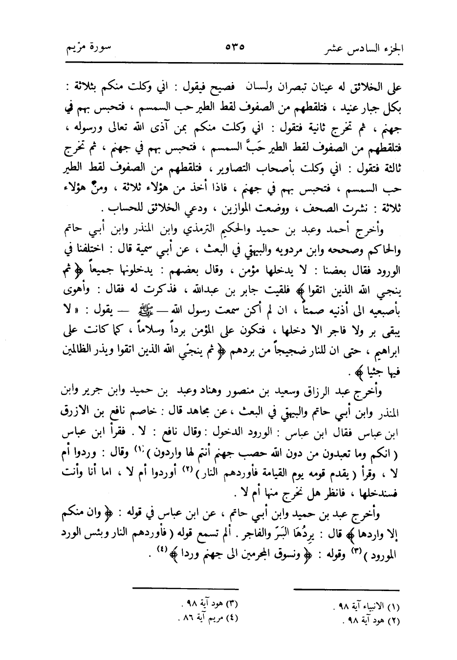 فَقَرَأَ ابْن عَبَّاس (إِنَّكُم وَمَا تَعْبدُونَ من دون الله حصب جَهَنَّم أَنْتُم لَهَا وَارِدُونَ) (الْأَنْبِيَاء آيَة 98) وَقَالَ: وردوا أم لَا وَقَرَأَ (يقدم قومه يَوْم الْقِيَامَة فأوردهم النَّار) (هود آيَة 98) أوردوا أم لَا أما أَنا وَأَنت فسندخلها فَانْظُر هَل نخرج مِنْهَا أم لَا