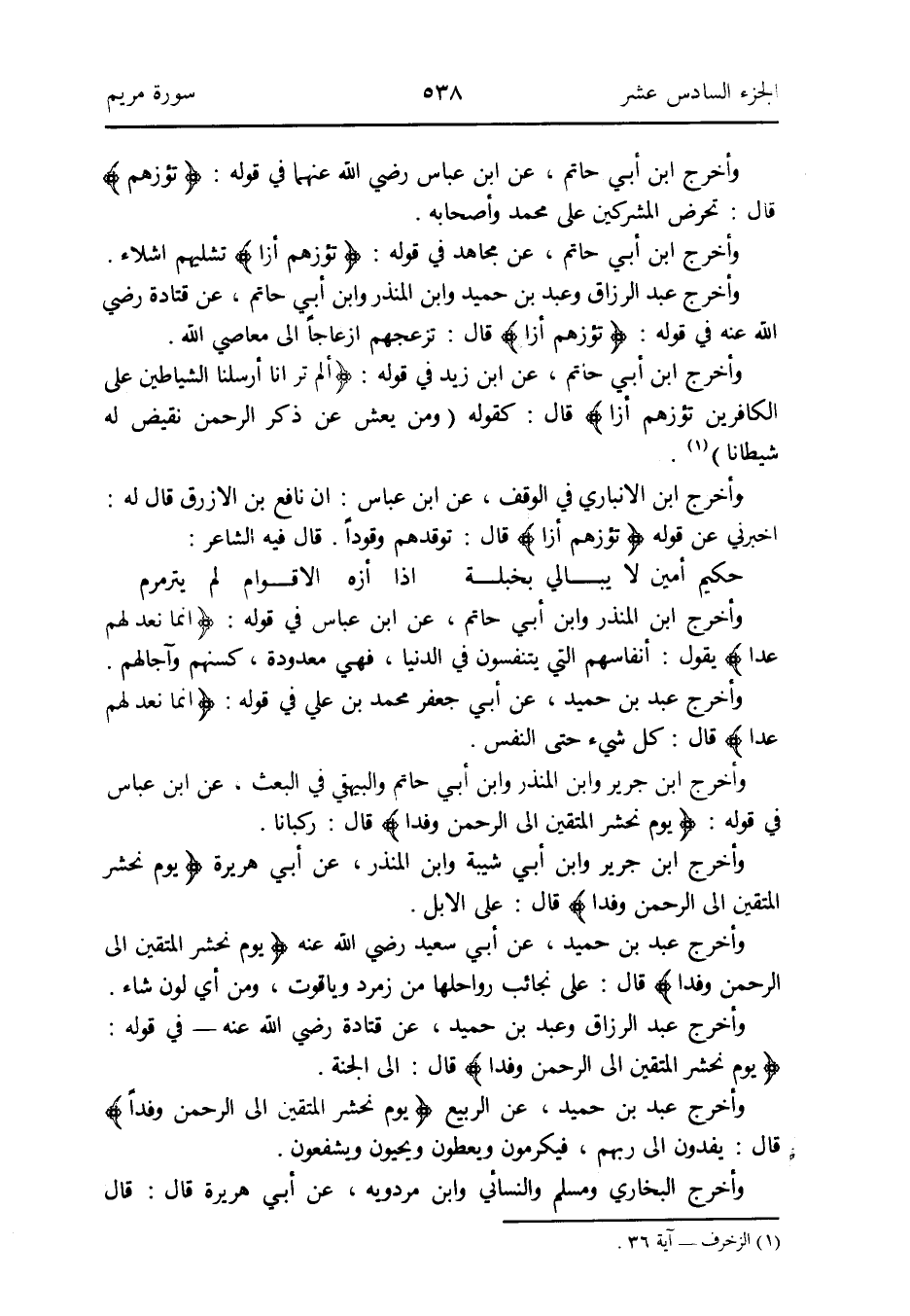 وَأخرج ابْن أبي حَاتِم عَن ابْن زيد فِي قَوْله: {ألم تَرَ أنَّا أرسلنَا الشَّيَاطِين على الْكَافرين تؤزهم أزاً} قَالَ: كَقَوْلِه: (وَمن يَعش عَن ذكر الرَّحْمَن نقيض لَهُ شَيْطَانا) (الزخرف آيَة 36)