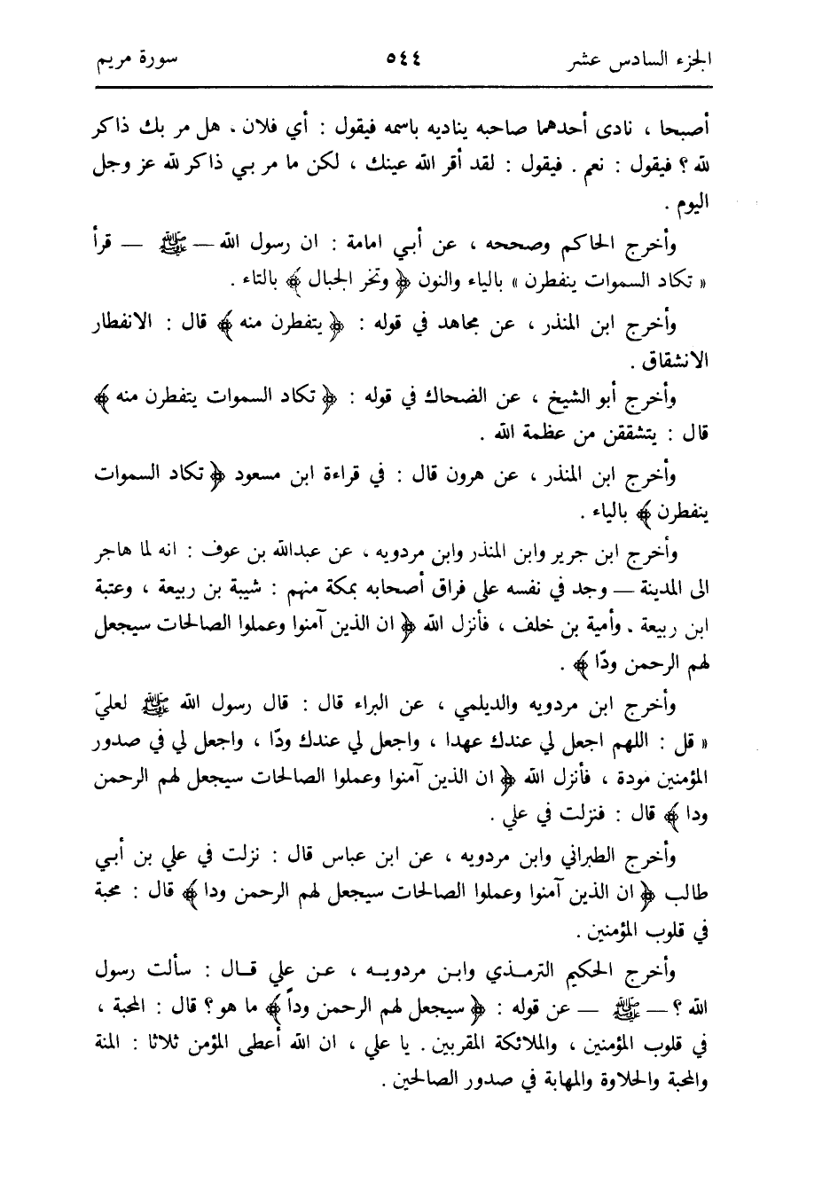 وَأخرج الطَّبَرَانِيّ وَابْن مرْدَوَيْه عَن ابْن عَبَّاس قَالَ: نزلت فِي عَليّ بن أبي طَالب {إِن الَّذين آمنُوا وَعمِلُوا الصَّالِحَات سَيجْعَلُ لَهُم الرَّحْمَن ودا} قَالَ: محبَّة فِي قُلُوب الْمُؤمنِينَ