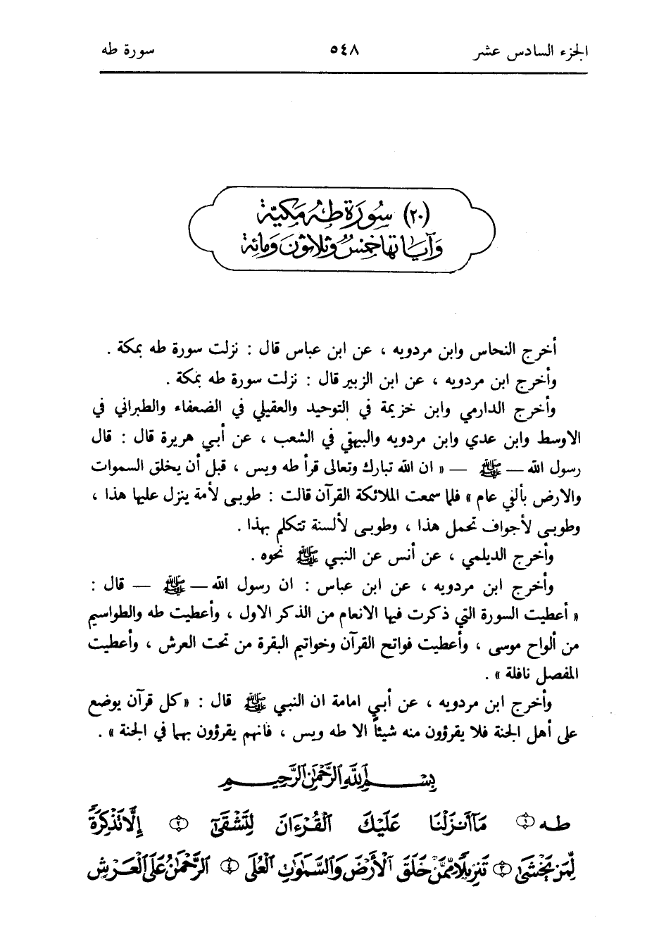 مُقَدّمَة سُورَة طه أخرج النّحاس وَابْن مرْدَوَيْه عَن ابْن عَبَّاس قَالَ: نزلت سُورَة طه بِمَكَّة