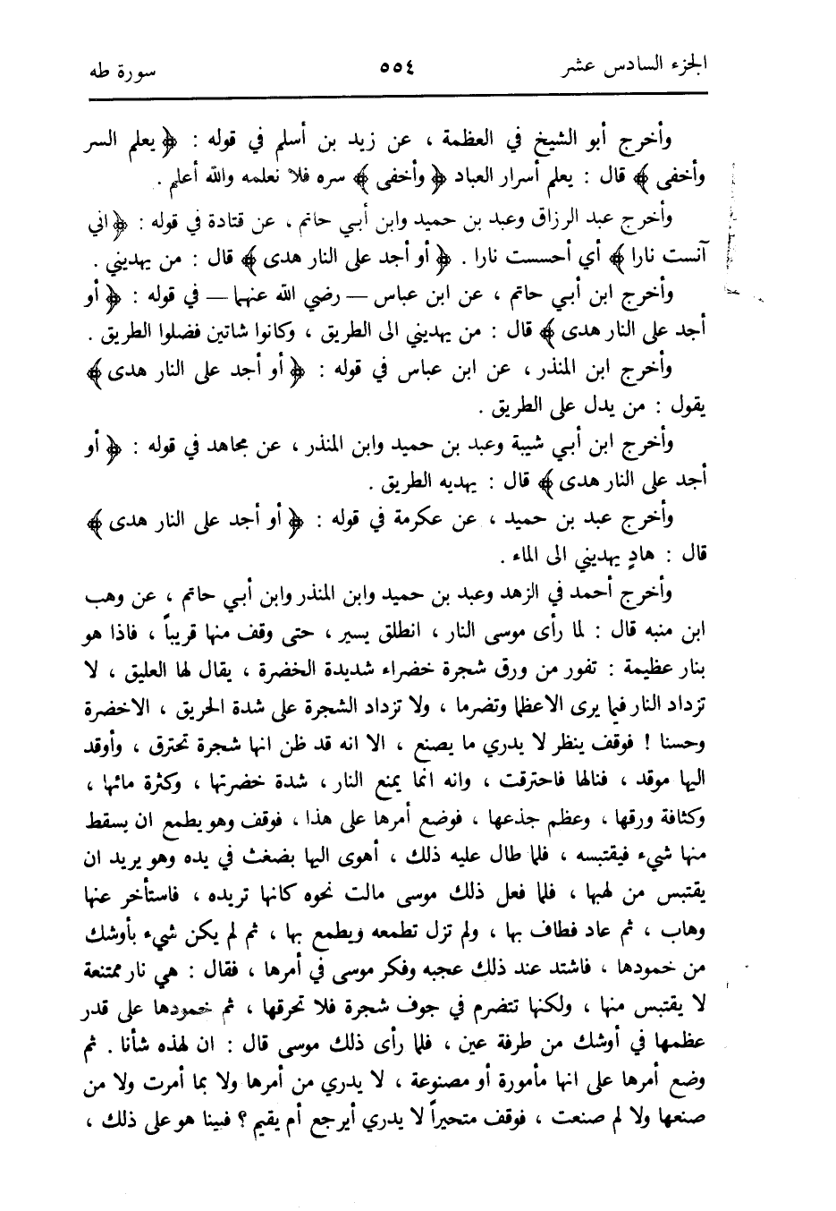 وَأخرج ابْن أبي حَاتِم عَن ابْن عَبَّاس - رَضِي الله عَنْهُمَا - فِي قَوْله: {أَو أجد على النَّار هدى} قَالَ: من يهديني إِلَى الطَّرِيق وَكَانُوا شَاتين فضلوا الطَّرِيق