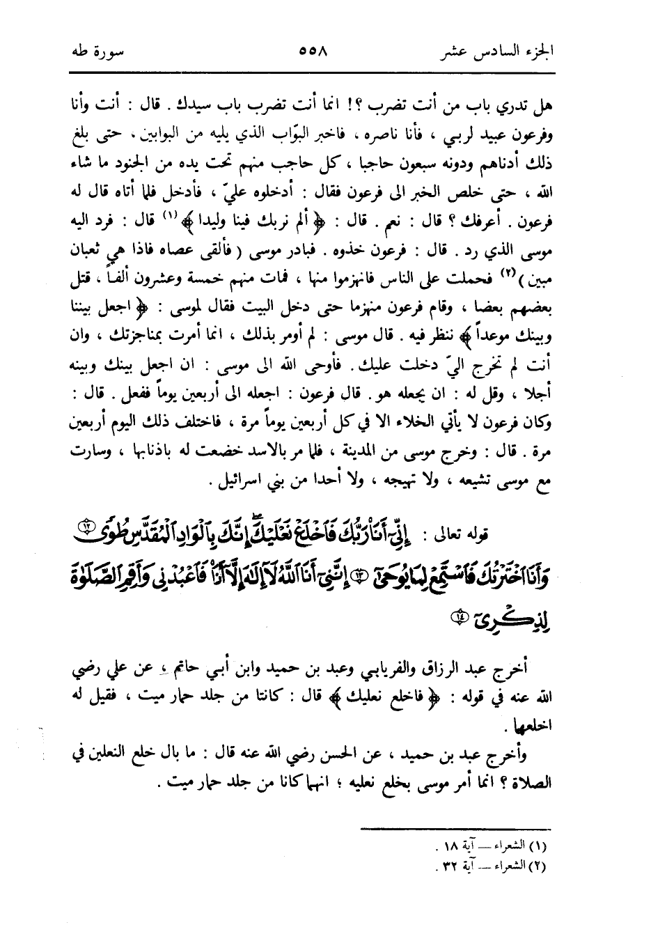 وَأخرج عبد بن حميد عَن الْحسن رَضِي الله عَنهُ قَالَ: مَا بَال خلع النَّعْلَيْنِ فِي الصَّلَاة إِنَّمَا أَمر مُوسَى بخلع نَعْلَيْه إنَّهُمَا كَانَتَا من جلد حمَار ميت