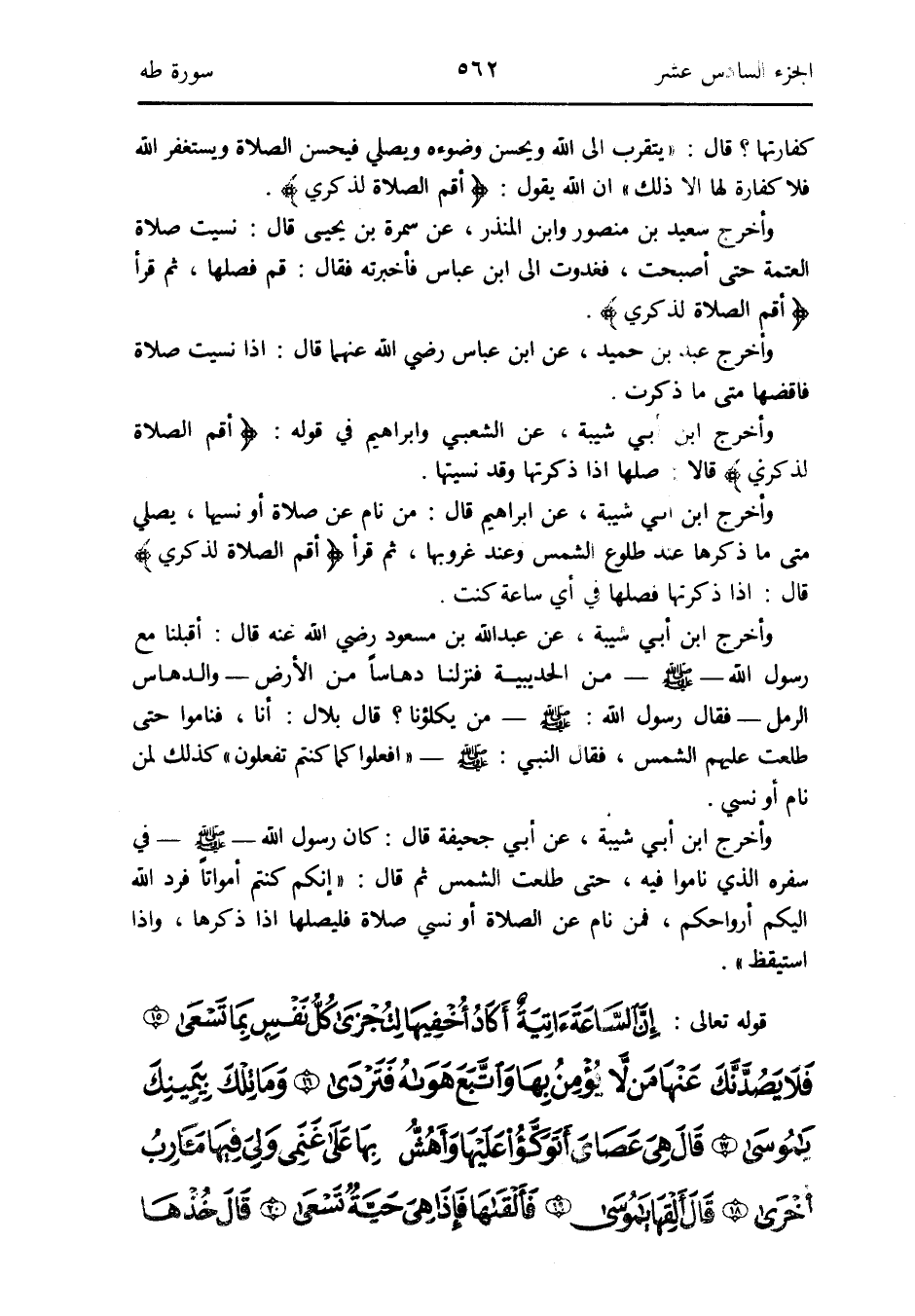 وَأخرج سعيد بن مَنْصُور وَابْن الْمُنْذر عَن سَمُرَة بن يحيى قَالَ: نسيت صَلَاة الْعَتَمَة حَتَّى أَصبَحت فَغَدَوْت إِلَى ابْن عَبَّاس فَأَخْبَرته فَقَالَ: قُم فصلها ثمَّ قَرَأَ {وأقم الصَّلَاة لذكري}