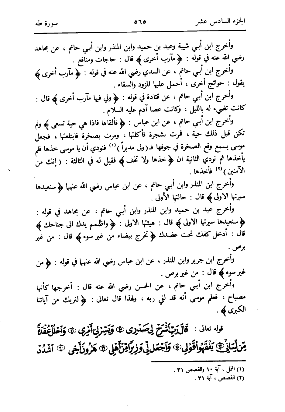 وَأخرج عبد بن حميد وَابْن الْمُنْذر وَابْن أبي حَاتِم عَن مُجَاهِد فِي قَوْله: {سنعيدها سيرتها الأولى} قَالَ: هيئتها الأولى: {واضمم يدك إِلَى جناحك} قَالَ: أَدخل كفك تَحت عضدك {تخرج بَيْضَاء من غير سوء} قَالَ: من غير برص