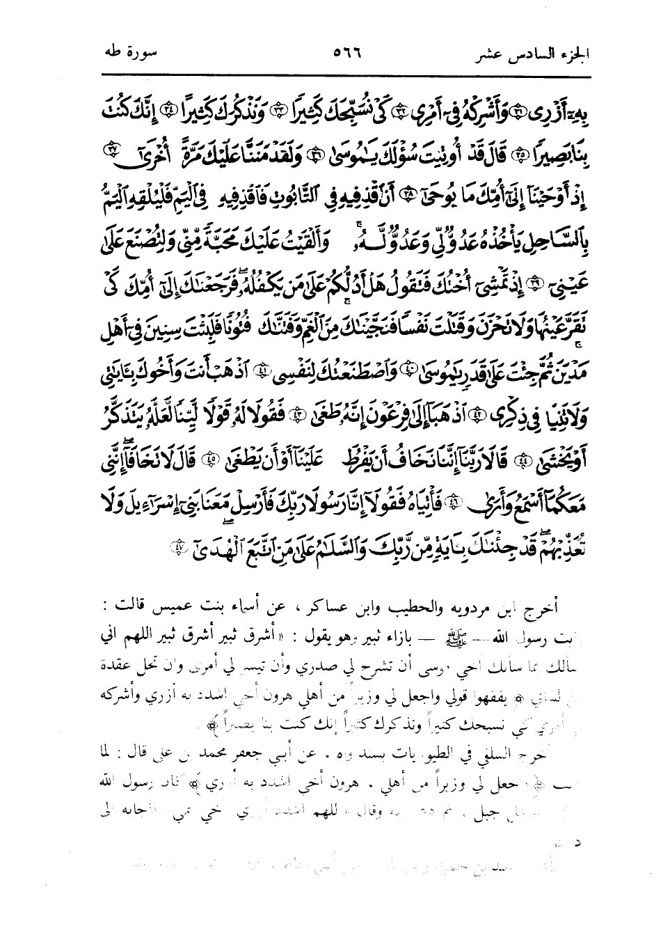 أخرج ابْن مرْدَوَيْه والخطيب وَابْن عَسَاكِر عَن أَسمَاء بنت عُمَيْس قَالَ: رَأَيْت رَسُول الله صلى الله عَلَيْهِ وَسلم بِإِزَاءِ ثبير وَهُوَ يَقُول: أشرق ثبير أشرق ثبير اللَّهُمَّ إِنِّي أَسأَلك بِمَا سَأَلَك أخي مُوسَى أَن تشرح لي صَدْرِي وَأَن تيَسّر لي أَمْرِي وَأَن تحل عقدَة من لساني {يفقهوا قولي وَاجعَل لي وزيراً من أَهلِي هَارُون أخي اشْدُد بِهِ أزري وأشركه فِي أَمْرِي كي نسبحك كثيرا ونذكرك كثيرا إِنَّك كنت بِنَا بَصيرًا}