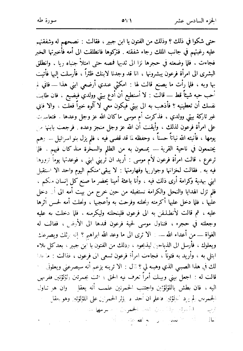 فَرَجَعت بابنها من يَوْمهَا فأنبته الله نباتاً حسنا وَحفظه لما قد قضى فِيهِ فَلم يزل بَنو إِسْرَائِيل - وهم يَجْتَمعُونَ فِي نَاحيَة الْقرْيَة - يمتنعون بِهِ من الظُّلم والسخرة مُنْذُ كَانَ فيهم فَلَمَّا ترعرع قَالَت امْرَأَة فِرْعَوْن لأم مُوسَى: أُرِيد أَن تريني ابْني فوعدتها يَوْمًا تزورها فِيهِ بِهِ