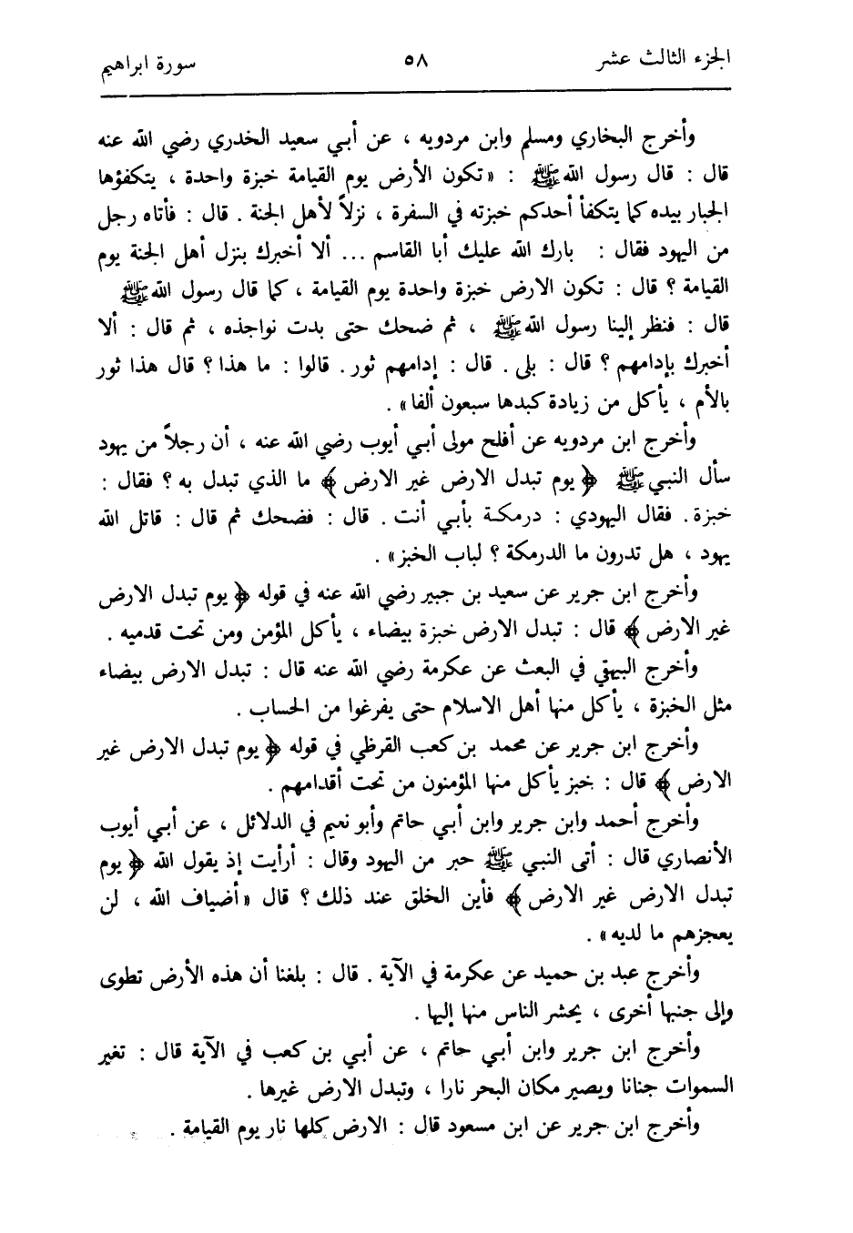 وَأخرج البُخَارِيّ وَمُسلم وَابْن مرْدَوَيْه عَن أبي سعيد الْخُدْرِيّ رَضِي الله عَنهُ قَالَ: قَالَ رَسُول الله صلى الله عَلَيْهِ وَسلم: تكون الأَرْض يَوْم الْقِيَامَة خبْزَة وَاحِدَة يَتَكَفَّؤُهَا الْجَبَّار بِيَدِهِ كَمَا يَتَكَفَّأ أحدكُم خبزته فِي السفرة نزلا لأهل الْجنَّة