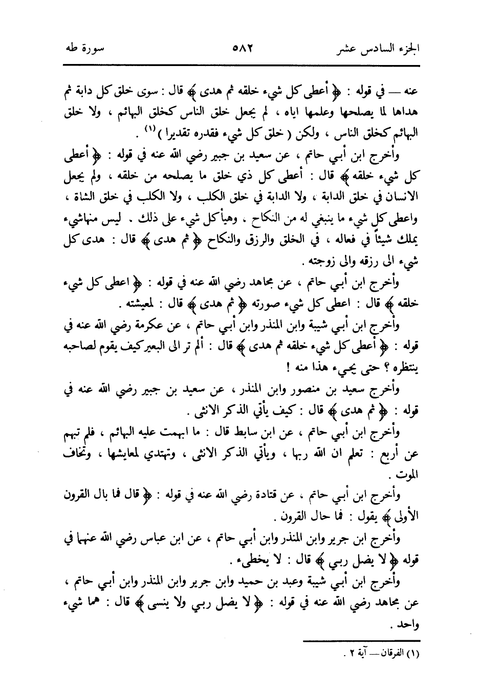 عَنهُ - فِي قَوْله: {أعْطى كل شَيْء خلقه ثمَّ هدى} قَالَ: سوى خلق كل دَابَّة ثمَّ هداها لما يصلحها وَعلمهَا إِيَّاه لم يَجْعَل خلق النَّاس كخلق الْبَهَائِم وَلَا خلق الْبَهَائِم كخلق النَّاس وَلَكِن (خلق كل شَيْء فقدره تَقْديرا) (الْفرْقَان آيَة 2)