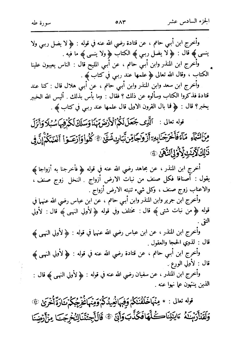 وَأخرج ابْن جرير وَابْن الْمُنْذر وَابْن أبي حَاتِم عَن ابْن عَبَّاس رَضِي الله عَنْهُمَا فِي قَوْله: {من نَبَات شَتَّى} قَالَ: مُخْتَلف وَفِي قَوْله: {لأولي النهى} قَالَ: لأولي التقى