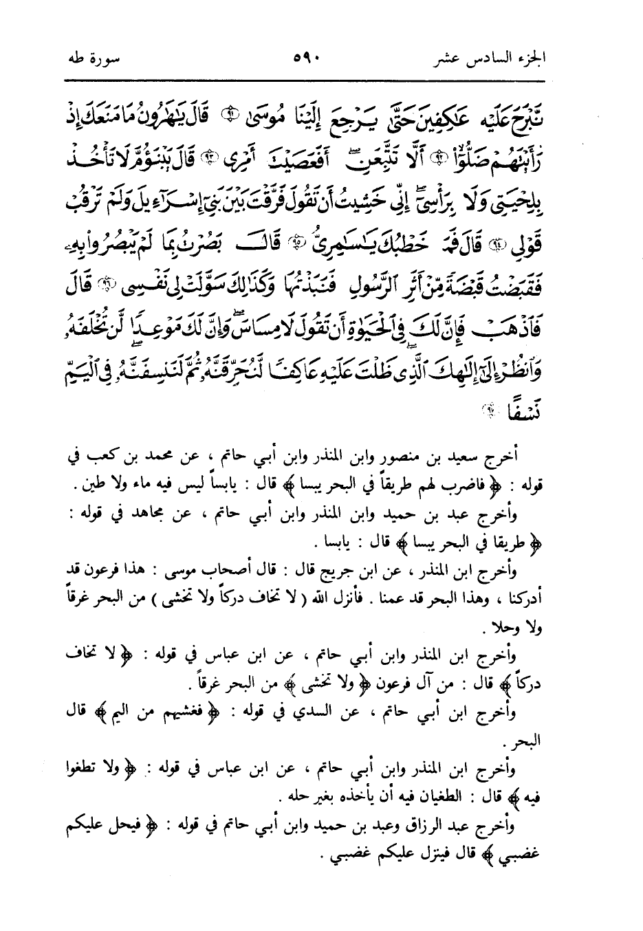 وَأخرج ابْن الْمُنْذر وَابْن أبي حَاتِم عَن ابْن عَبَّاس فِي قَوْله: {لَا تخَاف دركاً} قَالَ: من آل فِرْعَوْن {وَلَا تخشى} من الْبَحْر غرقاً
