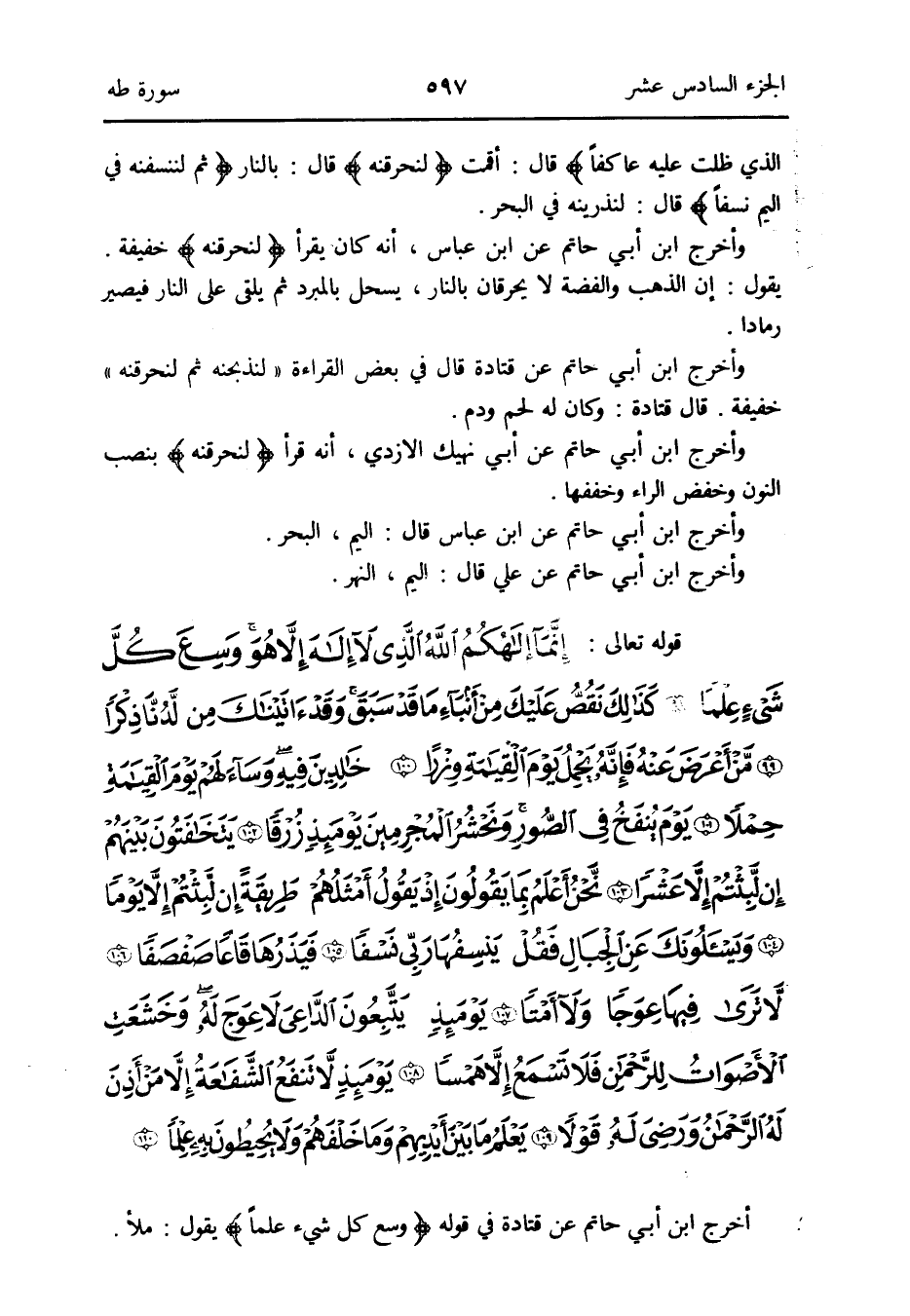 قَالَ: أَقمت {لنحرقنه} قَالَ: بالنَّار {ثمَّ لننسفنه فِي اليم نسفاً} قَالَ: لنذرينه فِي الْبَحْر