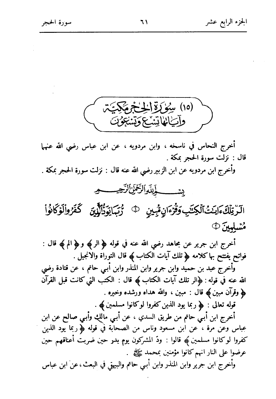 مُقَدّمَة سُورَة الْحجر أخرج النّحاس فِي ناسخه وَابْن مرْدَوَيْه عَن ابْن عَبَّاس رَضِي الله عَنْهُمَا قَالَ: نزلت سُورَة الْحجر بِمَكَّة