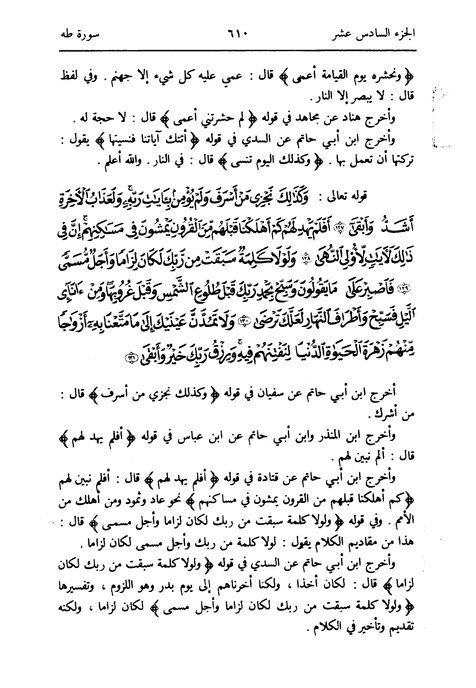وَأخرج ابْن أبي حَاتِم عَن السّديّ فِي قَوْله: {وَلَوْلَا كلمة سبقت من رَبك لَكَانَ لزاماً} قَالَ: لَكَانَ أخذا وَلَكنَّا أخرناهم إِلَى يَوْم بدر وَهُوَ اللُّزُوم وتفسيرها {وَلَوْلَا كلمة سبقت من رَبك لَكَانَ لزاماً وَأجل مُسَمّى} لَكَانَ لزاماً وَلكنه تَقْدِيم وَتَأْخِير فِي الْكَلَام