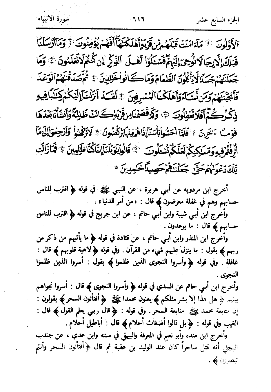 وَأخرج ابْن أبي حَاتِم عَن السّديّ فِي قَوْله: {وأسروا النَّجْوَى} قَالَ: أَسرُّوا نَجوَاهُمْ بَينهم {هَل هَذَا إِلَّا بشر مثلكُمْ} يعنون مُحَمَّد صلى الله عَلَيْهِ وَسلم {أفتأتون السحر} يَقُولُونَ: إِن مُتَابعَة مُحَمَّد صلى الله عَلَيْهِ وَسلم مُتَابعَة السحر