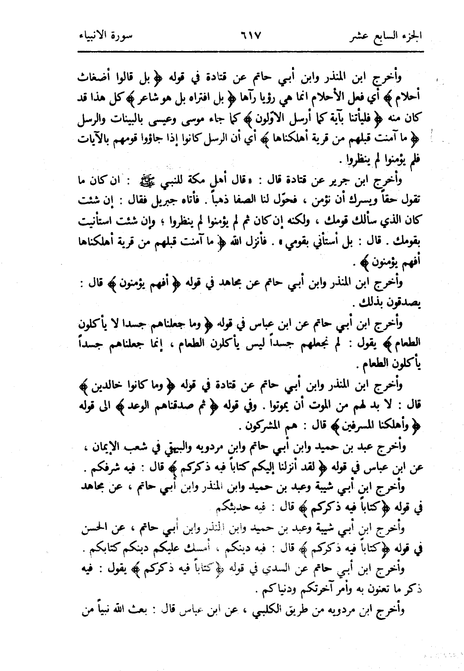 وَأخرج ابْن الْمُنْذر وَابْن أبي حَاتِم عَن قَتَادَة فِي قَوْله: {بل قَالُوا أضغاث أَحْلَام} أَي فعل الأحلام إِنَّمَا هِيَ رُؤْيا رَآهَا {بل افتراه بل هُوَ شَاعِر} كل هَذَا قد كَانَ مِنْهُ {فليأتنا بِآيَة كَمَا أرسل الأوّلون} كَمَا جَاءَ مُوسَى وَعِيسَى بِالْبَيِّنَاتِ وَالرسل {مَا آمَنت قبلهم من قَرْيَة أهلكناها} أَي أَن الرُّسُل كَانُوا إِذا جاؤوا قَومهمْ بِالْآيَاتِ فَلم يُؤمنُوا لم ينْظرُوا