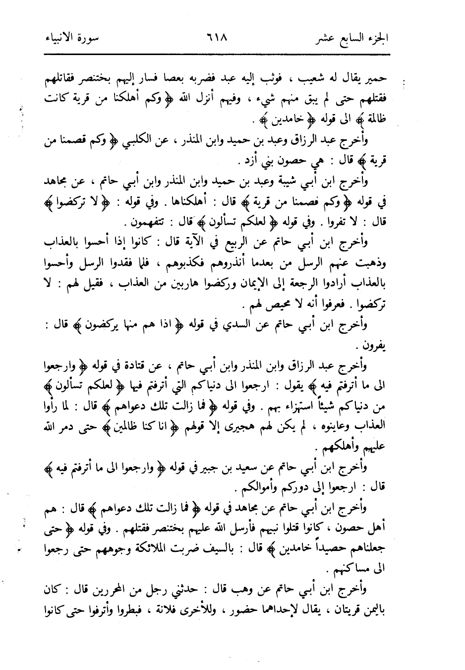 وَأخرج ابْن أبي شيبَة وَعبد بن حميد وَابْن الْمُنْذر وَابْن أبي حَاتِم عَن مُجَاهِد فِي قَوْله: {وَكم قصمنا من قَرْيَة} قَالَ: أهلكناها
