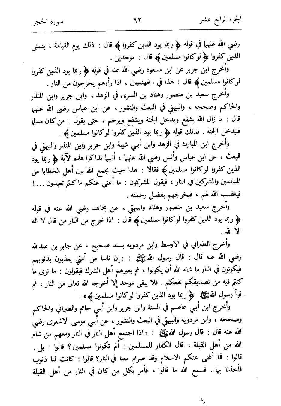 وَأخرج سعيد بن مَنْصُور وهناد وَالْبَيْهَقِيّ عَن مُجَاهِد رَضِي الله عَنهُ فِي قَوْله: {رُبمَا يود الَّذين كفرُوا لَو كَانُوا مُسلمين} قَالَ: إِذا خرج من النَّار من قَالَ: لَا إِلَه إِلَّا الله