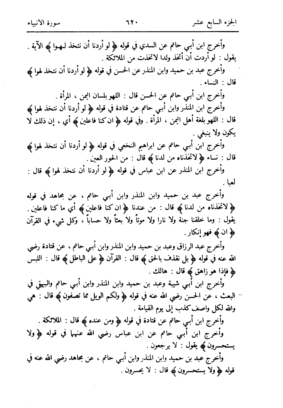 وَأخرج ابْن الْمُنْذر وَابْن أبي حَاتِم عَن قَتَادَة فِي قَوْله: {لَو أردنَا أَن نتَّخذ لهواً} قَالَ: اللَّهْو بلغَة أهل الْيمن الْمَرْأَة