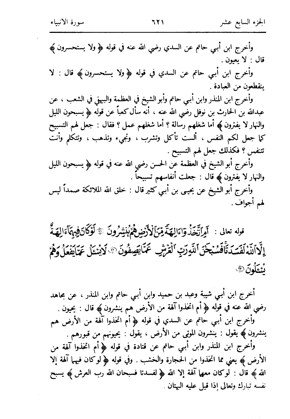 وَأخرج ابْن أبي حَاتِم عَن السّديّ فِي قَوْله: {وَلَا يستحسرون} قَالَ: لَا ينقطعون من الْعِبَادَة