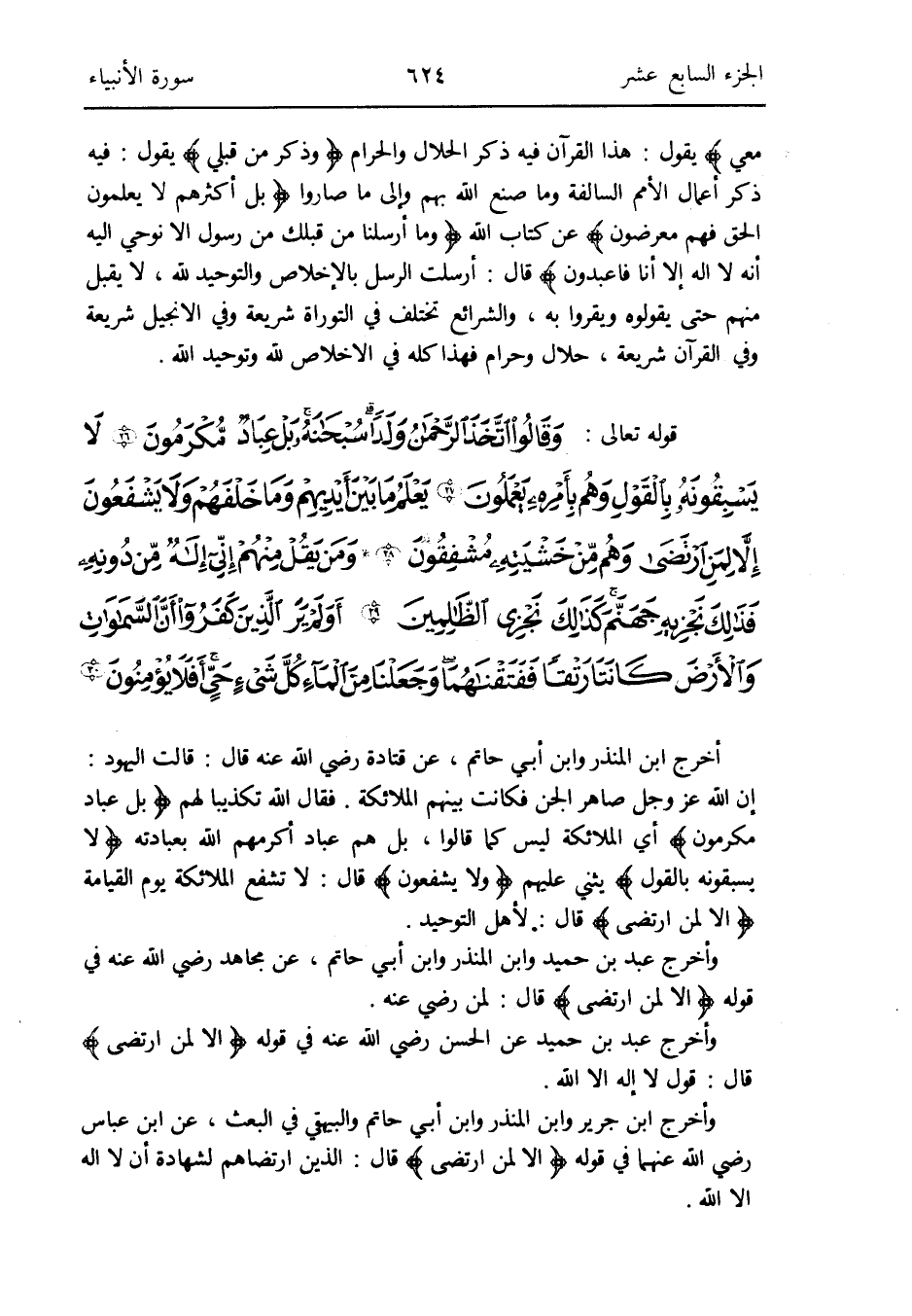 فَقَالَ الله تَكْذِيبًا لَهُم {بل عباد مكرمون} أَي الْمَلَائِكَة لَيْسَ كَا قَالُوا بل هم عباد أكْرمهم الله بِعِبَادَتِهِ {لَا يسبقونه بالْقَوْل} يثني عَلَيْهِم {وَلَا يشفعون} قَالَ: لَا تشفع الْمَلَائِكَة يَوْم الْقِيَامَة {إِلَّا لمن ارتضى} قَالَ: لأهل التَّوْحِيد