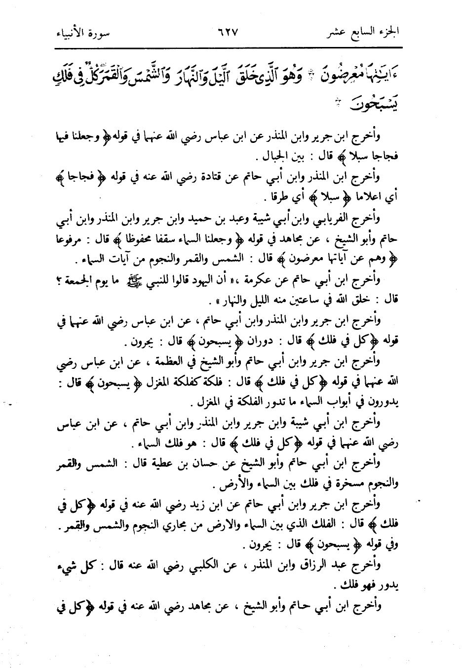 وَأخرج ابْن جرير وَابْن الْمُنْذر وَابْن أبي حَاتِم عَن ابْن عَبَّاس رَضِي الله عَنْهُمَا فِي قَوْله: {كل فِي فلك} قَالَ: دوران {يسبحون} قَالَ: يجرونَ