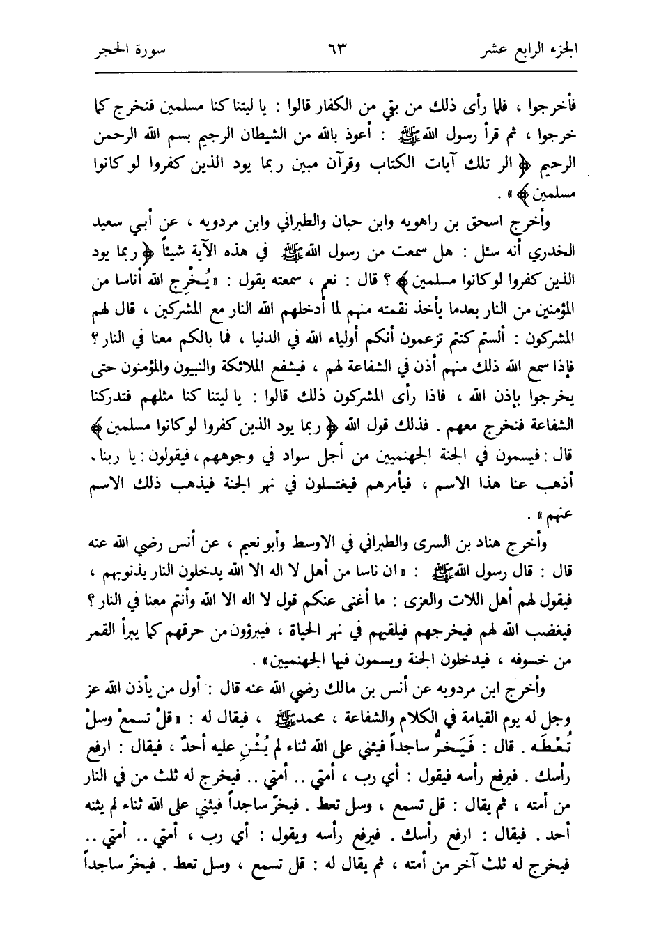 وَأخرج اسحق بن رَاهَوَيْه وَابْن حبَان وَالطَّبَرَانِيّ وَابْن مرْدَوَيْه عَن أبي سعيد الْخُدْرِيّ أَنه سُئِلَ: هَل سَمِعت من رَسُول الله صلى الله عَلَيْهِ وَسلم فِي هَذِه الْآيَة شَيْئا {رُبمَا يود الَّذين كفرُوا لَو كَانُوا مُسلمين} قَالَ: نعم سمعته يَقُول: يُخْرج الله أُنَاسًا من الْمُؤمنِينَ من النَّار بَعْدَمَا يَأْخُذ نقمته مِنْهُم لما أدخلهم الله النَّار مَعَ الْمُشْركين قَالَ لَهُم الْمُشْركُونَ: ألستم كُنْتُم تَزْعُمُونَ أَنكُمْ أَوْلِيَاء الله فِي الدُّنْيَا فَمَا بالكم مَعنا فِي النَّار فَإِذا سمع الله ذَلِك مِنْهُم أذن فِي الشَّفَاعَة لَهُم فَيشفع الْمَلَائِكَة والنبيون والمؤمنون حَتَّى يخرجُوا بِإِذن الله فاذا رأى الْمُشْركُونَ ذَلِك قَالُوا: يَا ليتنا كُنَّا مثلهم فتدركنا الشَّفَاعَة فنخرج مَعَهم