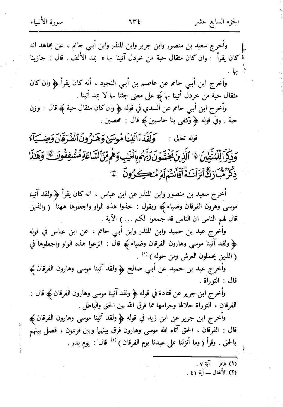 وَأخرج ابْن جرير عَن قَتَادَة فِي قَوْله: {وَلَقَد آتَيْنَا مُوسَى وَهَارُون الْفرْقَان} قَالَ: الْفرْقَان التَّوْرَاة حلالها وحرامها مِمَّا فرق الله بَين الْحق وَالْبَاطِل