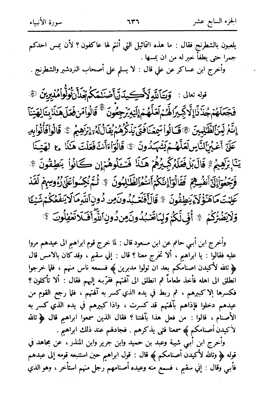 وَأخرج ابْن أبي حَاتِم عَن ابْن مَسْعُود قَالَ: لما خرج قوم إِبْرَاهِيم إِلَى عيدهم مروا عَلَيْهِ فَقَالُوا: يَا إِبْرَاهِيم أَلا تخرج مَعنا قَالَ: إِنِّي سقيم وَقد كَانَ بالْأَمْس قَالَ: {وتالله لأكيدن أصنامكم بعد أَن توَلّوا مُدبرين} فَسَمعهُ نَاس مِنْهُم فَلَمَّا خَرجُوا انْطلق إِلَى أَهله فَأخذ طَعَاما ثمَّ انْطلق إِلَى آلِهَتهم فقرّبه إِلَيْهِم فَقَالَ: أَلا تَأْكُلُونَ فَكَسرهَا إِلَّا كَبِيرهمْ ثمَّ ربط فِي يَده الَّذِي كسر بِهِ آلِهَتهم فَلَمَّا رَجَعَ الْقَوْم من عيدهم دخلُوا فَإِذا هم بآلهتهم قد كسرت وَإِذا كَبِيرهمْ فِي يَده الَّذِي كسر بِهِ الْأَصْنَام قَالُوا: من فعل هَذَا بآلهتنا فَقَالَ الَّذين سمعُوا إِبْرَاهِيم قَالَ: {وتالله لأكيدن أصنامكم} سمعنَا فَتى يذكرهم