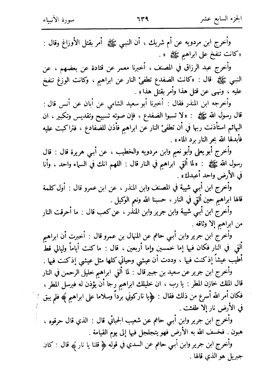 وَأخرج ابْن أبي شيبَة فِي المُصَنّف وَابْن الْمُنْذر عَن ابْن عَمْرو قَالَ: أول كلمة قَالَهَا إِبْرَاهِيم حِين ألقِي فِي النَّار حَسبنَا الله وَنعم الْوَكِيل