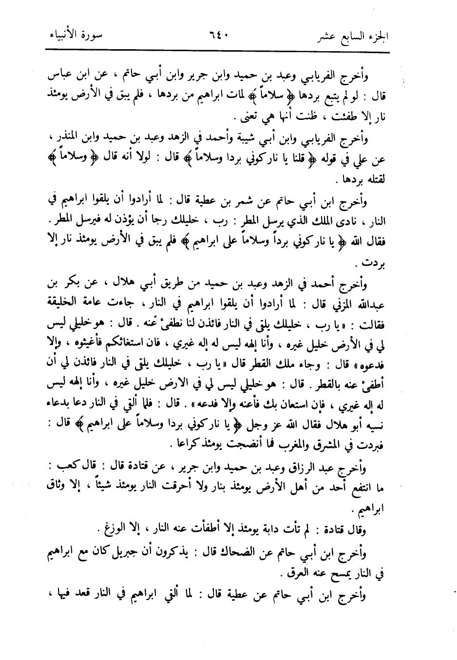 وَأخرج الْفرْيَابِيّ وَعبد بن حميد وَابْن جرير وَابْن أبي حَاتِم عَن ابْن عَبَّاس قَالَ: لَو لم يتبع بردهَا {سَلاما} لمات إِبْرَاهِيم من بردهَا فَلم يبْق فِي الأَرْض يَوْمئِذٍ نَار إِلَّا طفئت ظَنَنْت أَنَّهَا هِيَ تعنى