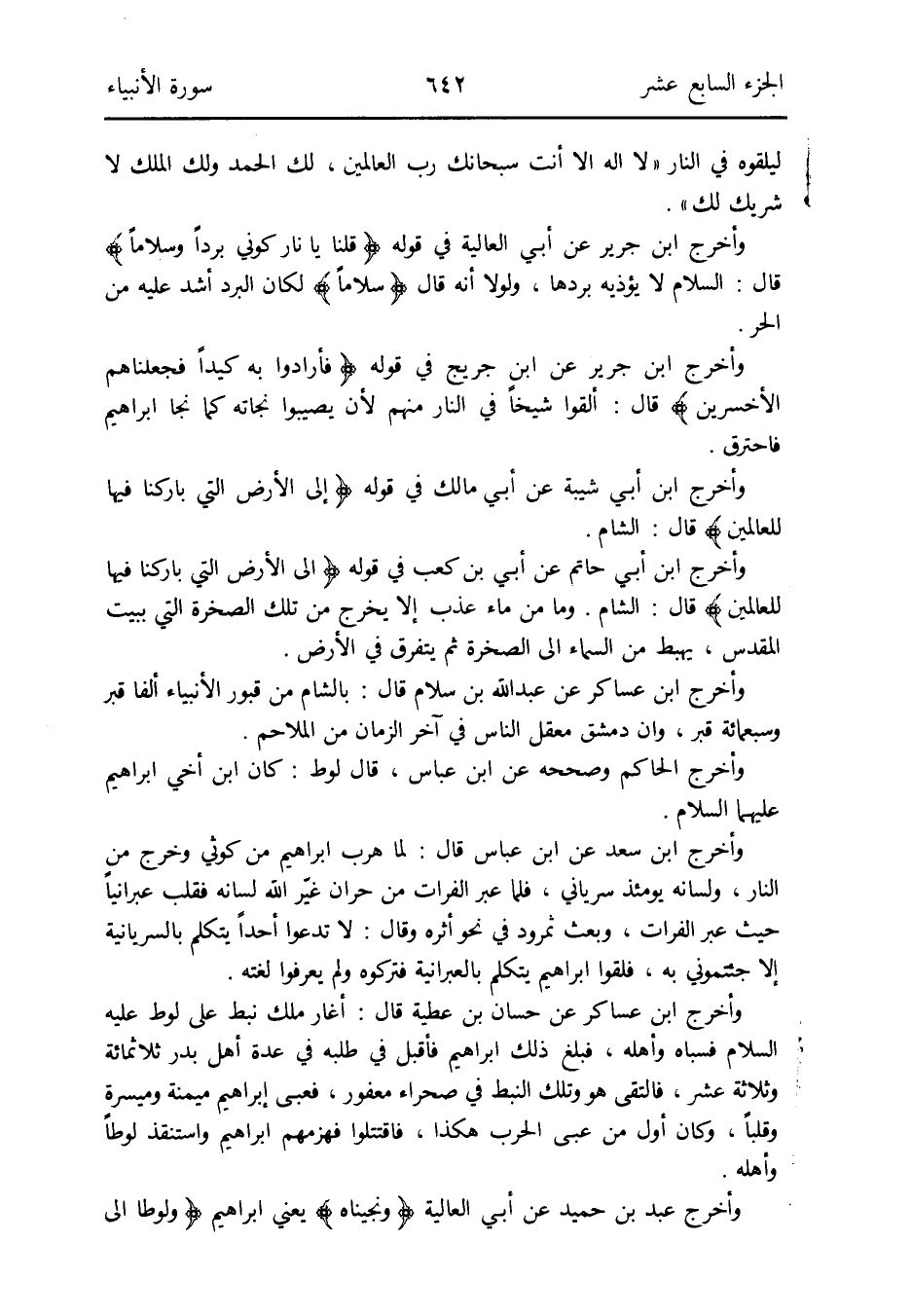وَأخرج ابْن جرير عَن أبي الْعَالِيَة فِي قَوْله: {قُلْنَا يَا نَار كوني بردا وَسلَامًا} قَالَ: السَّلَام لَا يُؤْذِيه بردهَا وَلَوْلَا أَنه قَالَ: {سَلاما} لَكَانَ الْبرد أَشد عَلَيْهِ من الْحر