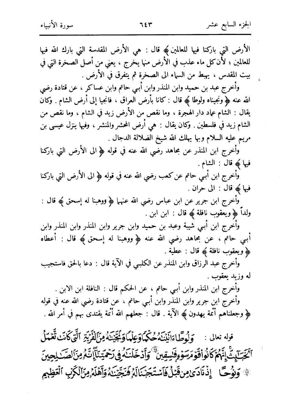وَأخرج عبد بن حميد وَابْن الْمُنْذر وَابْن أبي حَاتِم وَابْن عَسَاكِر عَن قَتَادَة رَضِي الله عَنهُ {ونجيناه ولوطاً} قَالَ: كَانَا بِأَرْض الْعرَاق فانجيا إِلَى أَرض الشَّام