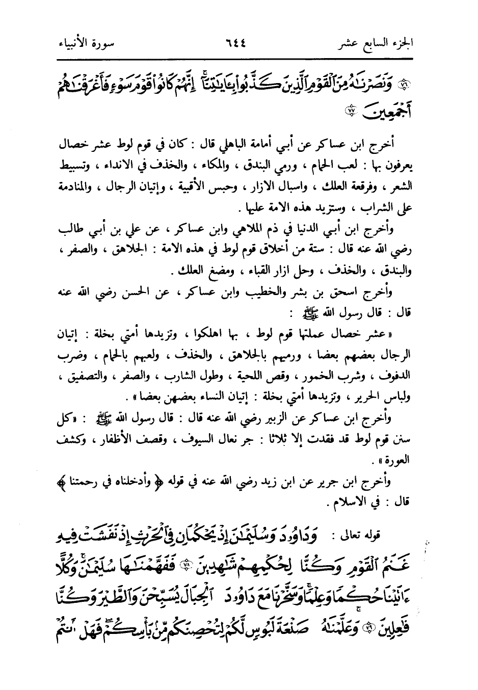واخرج اسحق بن بشر والخطيب وَابْن عَسَاكِر عَن الْحسن رَضِي الله عَنهُ قَالَ: قَالَ رَسُول الله صلى الله عَلَيْهِ وَسلم: عشر خِصَال عملتها قوم لوط بهَا اهلكوا وتزيدها أمتِي بخلة: إتْيَان الرِّجَال بَعضهم بَعْضًا ورميهم بالجلاهق ولعبهم الْحمام وَضرب الدفوف وَشرب الْخُمُور وقص اللِّحْيَة وَطول الشَّارِب والصفر والتصفيق ولباس الْحَرِير وتزيدها أمتِي بخلة: إتْيَان النِّسَاء بَعضهنَّ بَعْضًا