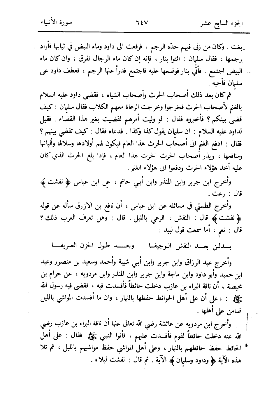 قَالَ: وَهل تعرف الْعَرَب ذَلِك قَالَ: نعم أما سَمِعت قَول لبيد: بدلن بعد النفش الوجيفا وَبعد ول الْحزن الصريفا وَأخرج عبد الرَّزَّاق وَابْن جرير وَابْن أبي شيبَة وَأحمد وَسَعِيد بن مَنْصُور وَعبد بن حميد وَأَبُو دَاوُد وَابْن ماجة وَابْن جرير وَابْن الْمُنْذر وَابْن مرْدَوَيْه عَن حرَام بن محيصة أَن نَاقَة الْبَراء بن عَازِب دخلت حَائِطا فأفسدت فِيهِ فَقضى فِيهِ رَسُول الله صلى الله عَلَيْهِ وَسلم: على أَن على أهل الحوائط حفظهَا بِالنَّهَارِ وَإِن مَا أفسدت الْمَوَاشِي بِاللَّيْلِ ضَامِن على أَهلهَا
