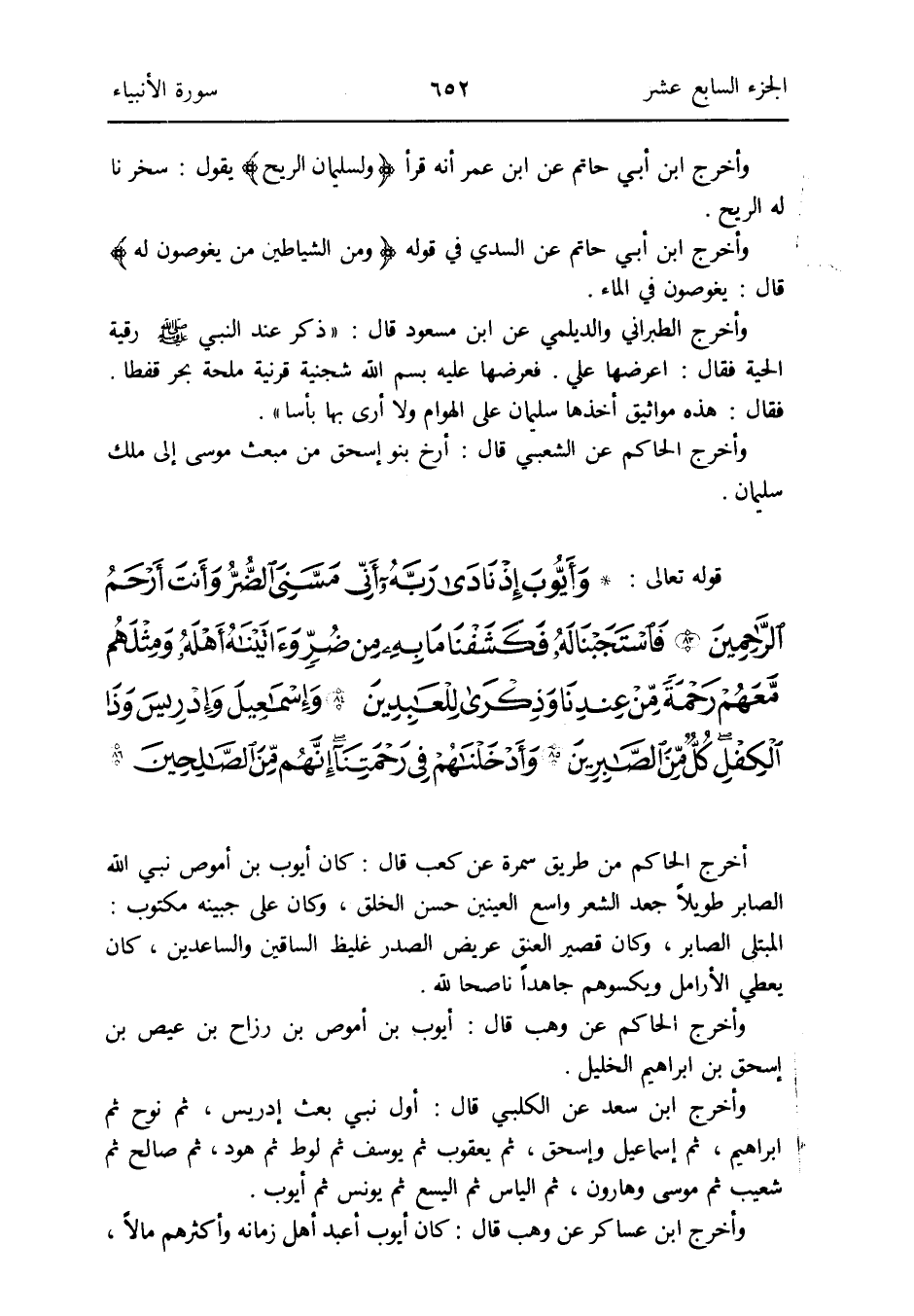 أخرج الْحَاكِم من طَرِيق سَمُرَة عَن كَعْب قَالَ: كَانَ أَيُّوب بن أموص نَبِي الله الصابر طَويلا جعد الشّعْر وَاسع الْعَينَيْنِ حسن الْخلق وَكَانَ على جَبينه مَكْتُوب: الْمُبْتَلى الصابر وَكَانَ قصير الْعُنُق عريض الصَّدْر غليظ السَّاقَيْن والساعدين كَانَ يُعْطي الأرامل ويكسوهم جاهداً ناصحاً لله