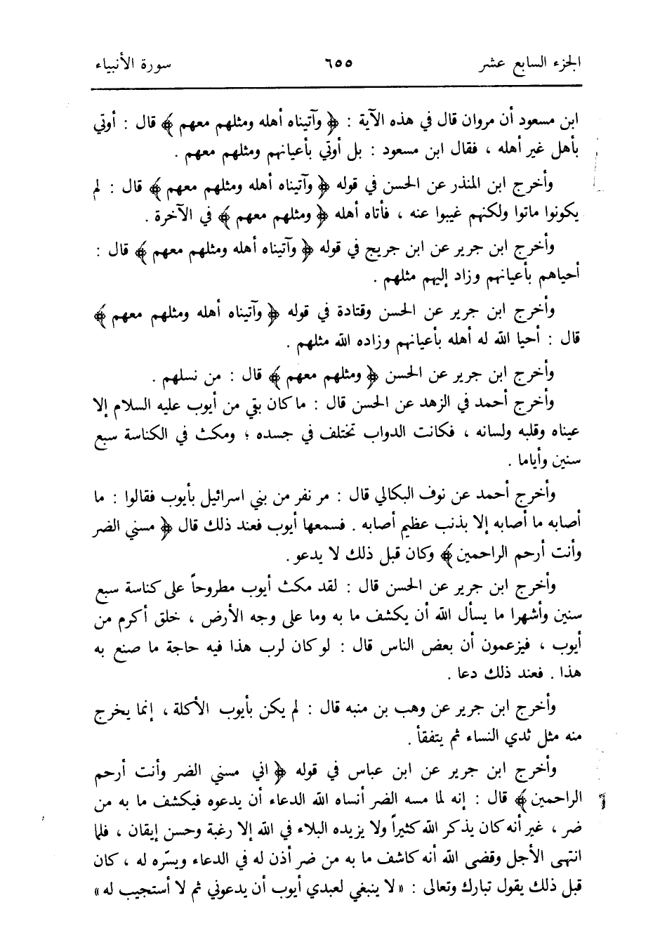 وَأخرج ابْن جرير عَن ابْن عَبَّاس فِي قَوْله: {أَنِّي مسني الضّر وَأَنت أرْحم الرَّاحِمِينَ} قَالَ: إِنَّه لما مَسّه الضّر أنساه الله الدُّعَاء أَن يَدعُوهُ فَيكْشف مَا بِهِ من ضرّ غير أَنه كَانَ يذكر الله كثيرا وَلَا يزِيدهُ الْبلَاء فِي الله إِلَّا رَغْبَة وَحسن إيقان فَلَمَّا انْتهى الْأَجَل وَقضى الله أَنه كاشف مَا بِهِ من ضرّ أذن لَهُ فِي الدُّعَاء ويسرّه لَهُ كَانَ قبل ذَلِك يَقُول تبَارك وَتَعَالَى: لَا يَنْبَغِي لعبدي أَيُّوب أَن يدعوني ثمَّ لَا أستجيب لَهُ