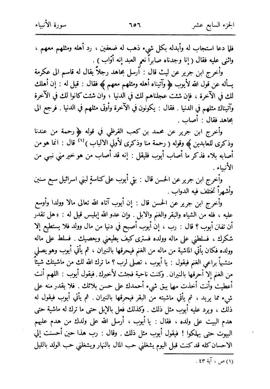 وَأخرج ابْن جرير عَن مُحَمَّد بن كَعْب الْقرظِيّ فِي قَوْله: {رَحْمَة من عندنَا وذكرى للعابدين} وَقَوله: (رَحْمَة منا وذكرى لأولي الْأَلْبَاب) (ص آيَة 43) قَالَ: إِنَّمَا هُوَ من أَصَابَهُ بلَاء فَذكر مَا أصَاب أَيُّوب فَلْيقل: إِنَّه قد أصَاب من هُوَ خير مني نَبِي من الْأَنْبِيَاء