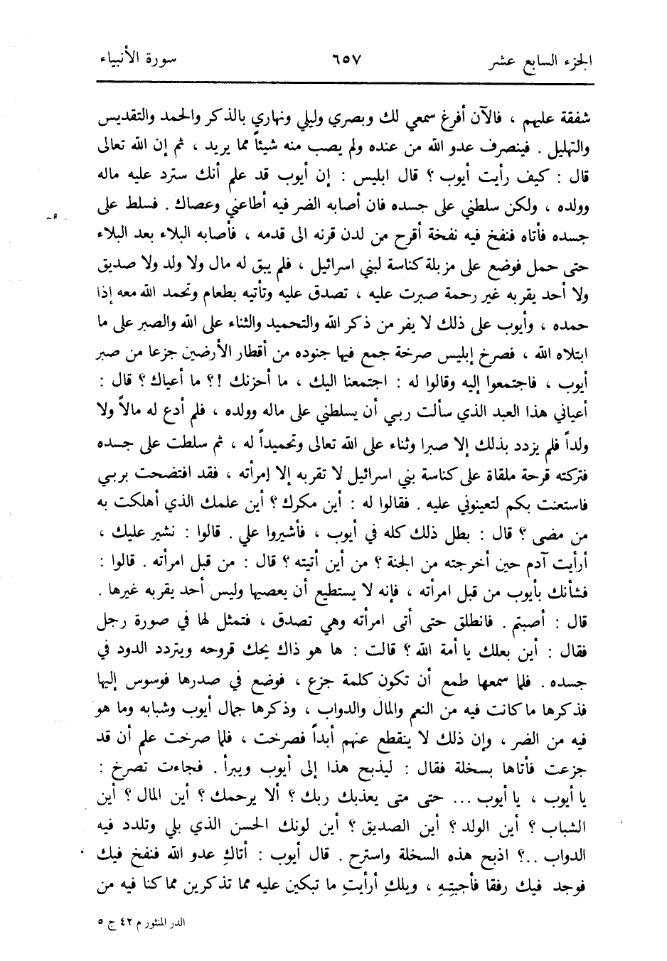 ثمَّ إِن الله تَعَالَى قَالَ: كَيفَ رَأَيْت أَيُّوب قَالَ إِبْلِيس: إِن أَيُّوب قد علم أَنَّك سترد عَلَيْهِ مَاله وَولده وَلَكِن سَلطنِي على جسده فَإِن أَصَابَهُ الضّر فِيهِ أَطَاعَنِي وعصاك