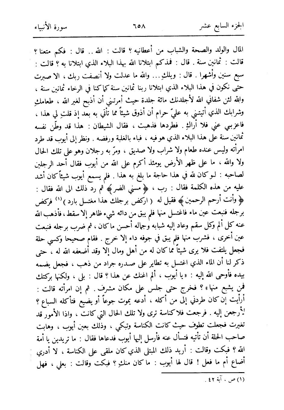فَلم يسمع أَيُّوب شَيْئا كَانَ أَشد عَلَيْهِ من هَذِه الْكَلِمَة فَقَالَ: رب {مسني الضّر} ثمَّ رد ذَلِك إِلَى الله فَقَالَ: {وَأَنت أرْحم الرَّاحِمِينَ} فَقيل لَهُ: (اركض برجلك هَذَا مغتسل بَارِد) (ص آيَة 42) فركض بِرجلِهِ فنبعت عين مَاء فاغتسل مِنْهَا فَلم يبْق من دائه شَيْء ظَاهر إِلَّا سقط فَأذْهب الله عَنهُ كل ألم وكل سقم وَعَاد إِلَيْهِ شبابه وجماله أحسن مَا كَانَ ثمَّ ضرب بِرجلِهِ فنبعت عين أُخْرَى فَشرب مِنْهَا فَلم يبْق فِي جَوْفه دَاء إِلَّا خرج