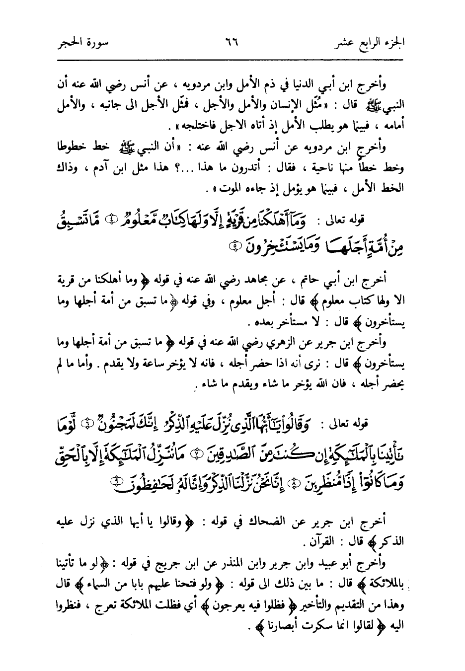 أخرج ابْن أبي حَاتِم عَن مُجَاهِد رَضِي الله عَنهُ فِي قَوْله: {وَمَا أهلكنا من قَرْيَة إِلَّا وَلها كتاب مَعْلُوم} قَالَ: أجل مَعْلُوم وَفِي قَوْله: {مَا تسبق من أمة أجلهَا وَمَا يَسْتَأْخِرُونَ} قَالَ: لَا مستأخر بعده